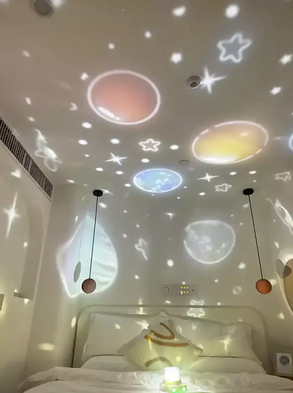 Children’s eyes are sensitive in the hour before sleep. We use three-color soft lighting with smooth, flicker-free transitions, so walls and ceilings become evenly lit canvases instead of glare points. You can move between starry and nebula effects, then fine-tune brightness for reading, quiet play, or lights-out. The goal is a quiet rotating galaxy projector for bedroom comfort – magical during storytelling, soothing during the final minutes before sleep.